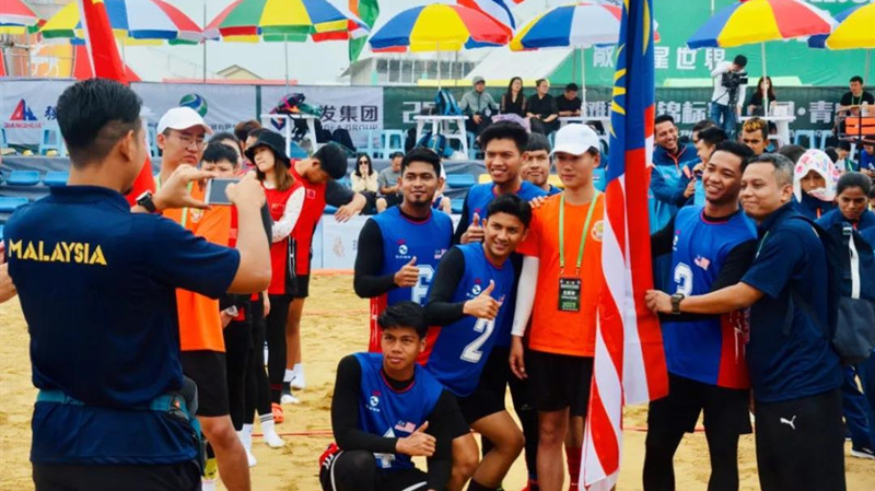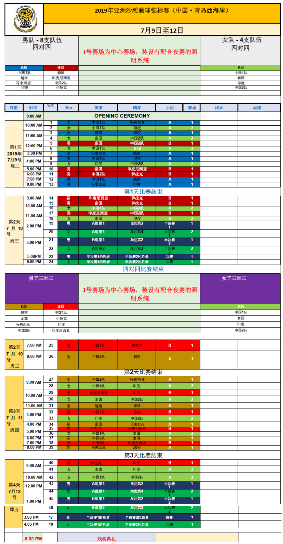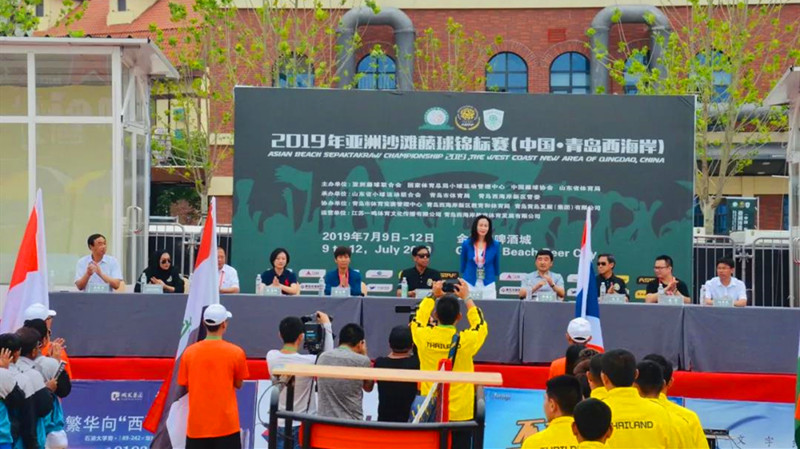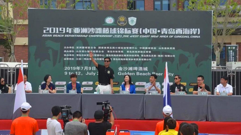 7月9日,2019亞洲沙灘藤球錦標(biāo)賽(中國(guó)·青島西海岸)在金沙灘啤酒城開賽。來自中國(guó)、越南、泰國(guó)、印度尼西亞、印度、馬來西亞、伊拉克7個(gè)國(guó)家的12支代表隊(duì)伍將為大家奉獻(xiàn)一場(chǎng)精彩絕倫的視覺盛宴。