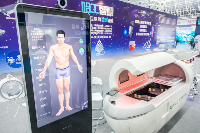 位于海工裝備與海洋科技展區(qū)內(nèi)的哈工大機器人集團展位里,人氣頗旺。哈工(青島)機器人有限公司哈工智慧市場總監(jiān)劉瑛正一邊演示一邊為大家介紹哈工大最新研發(fā)的機器人?!拔覀冏灾餮邪l(fā)了這套中醫(yī)問診系統(tǒng),這款艾灸機器人能夠依托傳感技術(shù)進行脈診,并通過圖像分析進行面診、舌診,搭配體質(zhì)辯診問題庫,生成報告后傳輸?shù)皆贫诉M行數(shù)據(jù)分析,會生成艾灸診療方案,機器人會根據(jù)方案通過點對點穴位為人體進行調(diào)理?!?